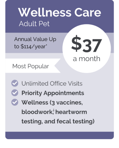 Plus, with our Wellness Care plans, you’ll enjoy priority appointments with same- or next-day scheduling whenever possible. Spread out the cost of services like dental care throughout the year, so you can give your pet the care they need without any financial stress.